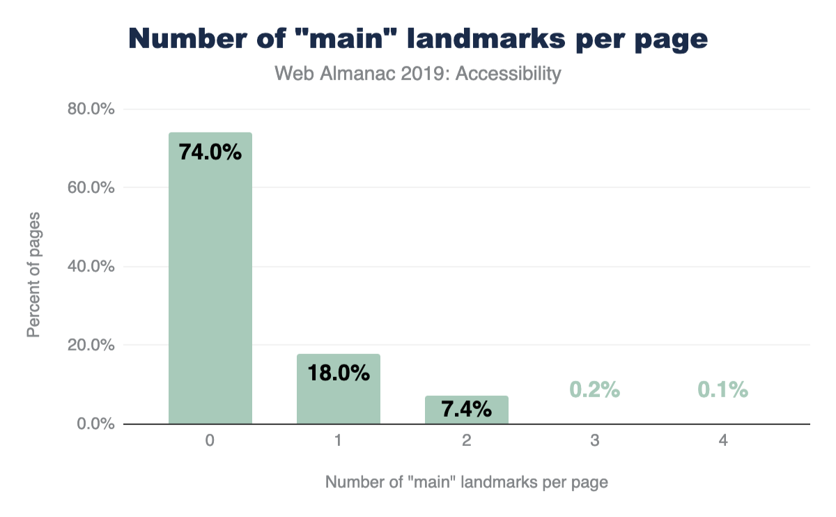 We found only one in every four pages (26.03%) include a main landmark. And surprisingly, 8.06% of pages erroneously contained more than one main landmark, leaving these users guessing which landmark contains the actual main content.