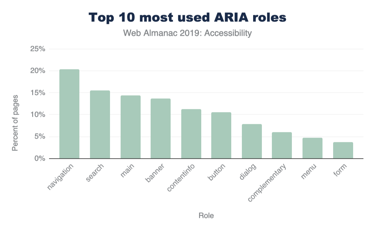 Currently, 46.91% of pages use at least one ARIA role attribute. In Figure 9.9 below, we’ve compiled a list of the top ten most widely used ARIA role values.