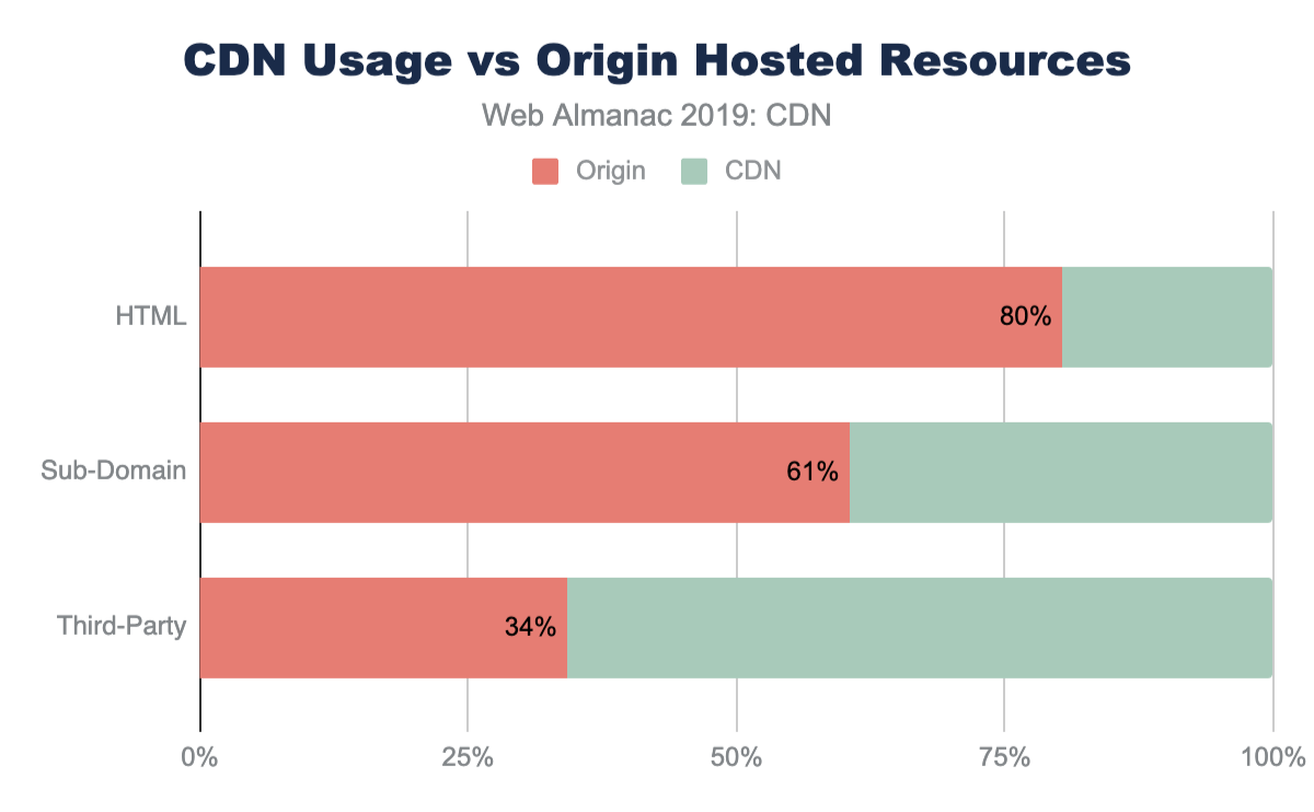Despite first-party resources still largely being served directly from origin, third-party resources have a substantially higher adoption of CDNs. Nearly 66% of all third-party resources are served from a CDN. Since third-party domains are more likely a SaaS integration, the use of CDNs are more likely core to these business offerings. Most third-party content breaks down to shared resources (JavaScript or font CDNs), augmented content (advertisements), or statistics. In all these cases, using a CDN will improve the performance and offload for these SaaS solutions.