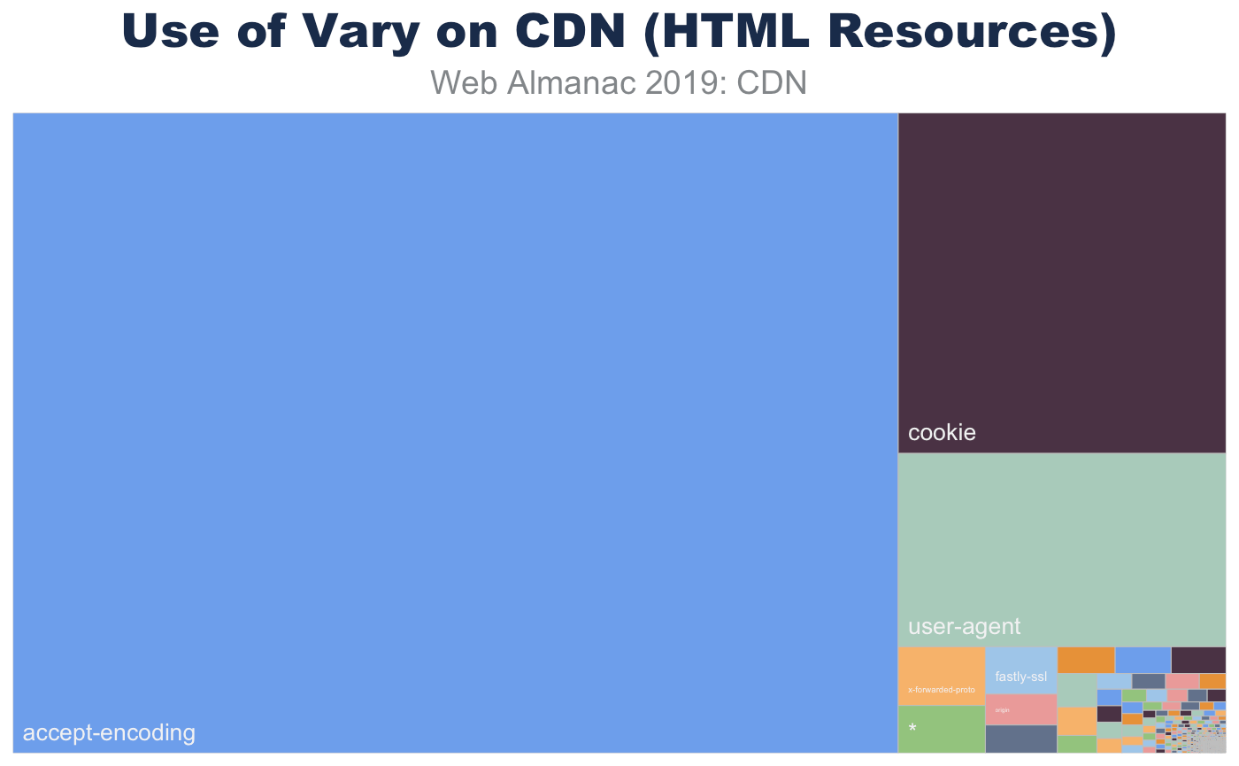 The Vary header also contains evidence of CDN chains. These can be seen in Vary headers such as Accept-Encoding, Accept-Encoding or even Accept-Encoding, Accept-Encoding, Accept-Encoding. Further analysis of these chains and Via header entries might reveal interesting data, for example how many sites are proxying third-party tags.