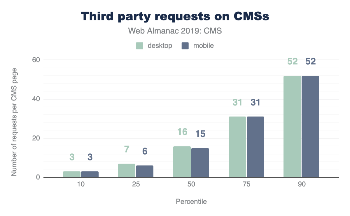 The median amount of 3rd party requests on mobile CMS pages is 15 and weigh 264.72 KB, while the median for these requests on desktop CMS pages is 16 and weigh 271.56 KB. (Note that this excludes 3P resources considered part of “hosting”).