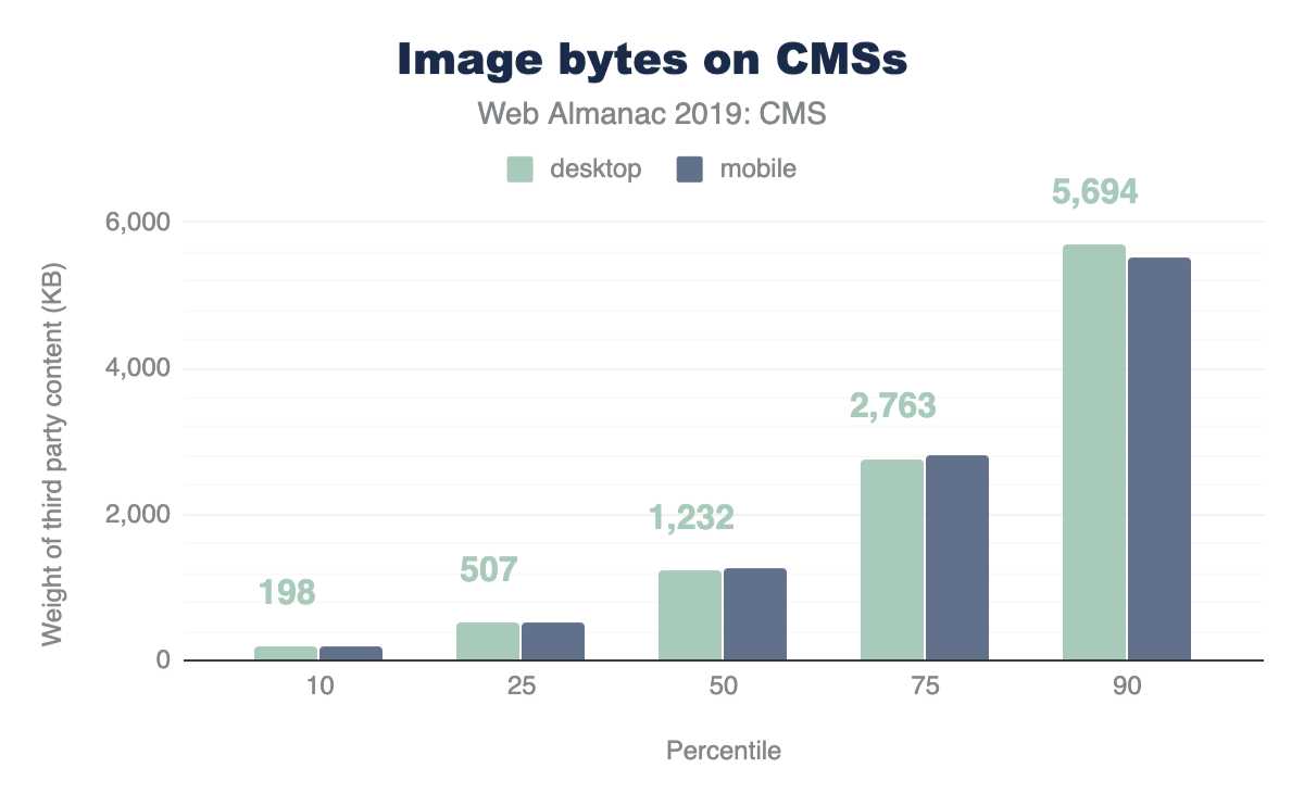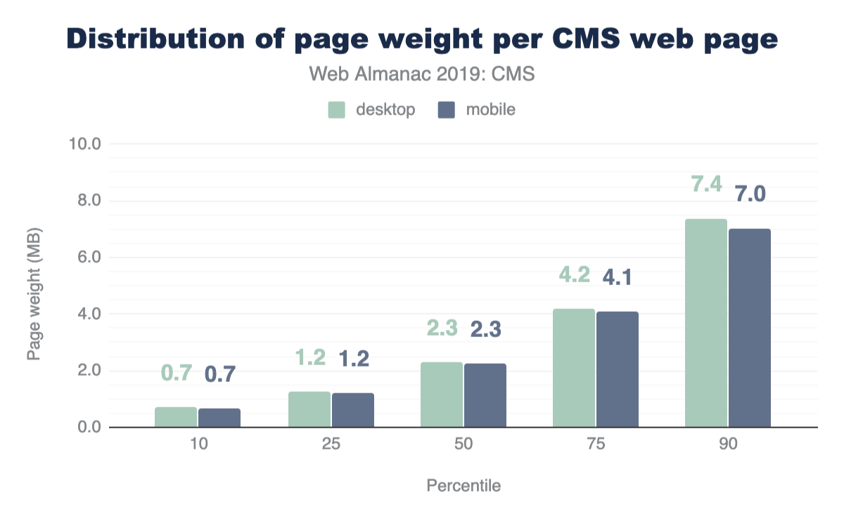 How do CMS pages compare to pages on the web as a whole? In the Page Weight chapter, we find some telling data about resource usage. At the median, desktop pages load 74 requests and weigh 1.9 MB, and mobile pages on the web load 69 requests and weigh 1.7 MB. The median CMS page exceeds this. CMS pages also exceed resources on the web at the 90th percentile, but by a smaller margin. In short: CMS pages could be considered as some of the heaviest.