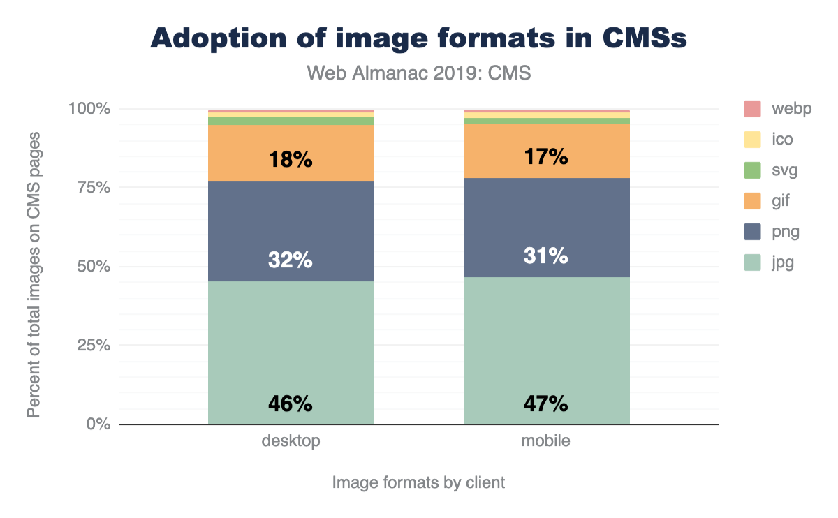Which are the common formats found on mobile and desktop CMS pages? From our data JPG images on average are the most popular image format. PNG and GIF formats follow, while formats like SVG, ICO, and WebP trail significantly comprising approximately a little over 2% and 1%.