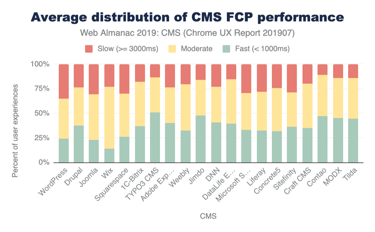 WordPress shows notably moderate and slow FCP experiences on mobile and desktop. Wix sits strongly in moderate FCP experiences on its closed platform. TYPO3, an enterprise open-source CMS platform, has consistently fast experiences on both mobile and desktop. TYPO3 advertises built-in performance and scalability features that may have a positive impact for website visitors on the frontend.