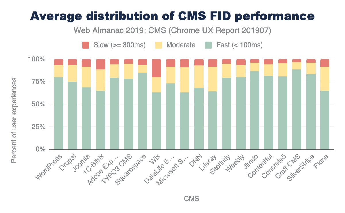While this difference is present in FCP data, FID sees bigger gaps in performance. For example, the difference between mobile and desktop fast FCP experiences for Joomla is around 12.78%, for FID experiences the difference is significant: 27.76%. Mobile device and connection quality could play a role in the performance gaps that we see here. As we highlighted previously, there is a small margin of difference between the resources shipped to desktop and mobile versions of a website. Optimizing for the mobile (interactive) experience becomes more apparent with these results.