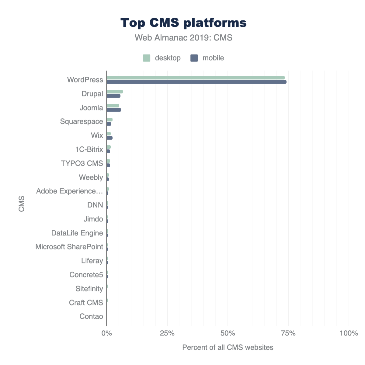 Figure 14.4. Percent of desktop and mobile websites that use a CMS.