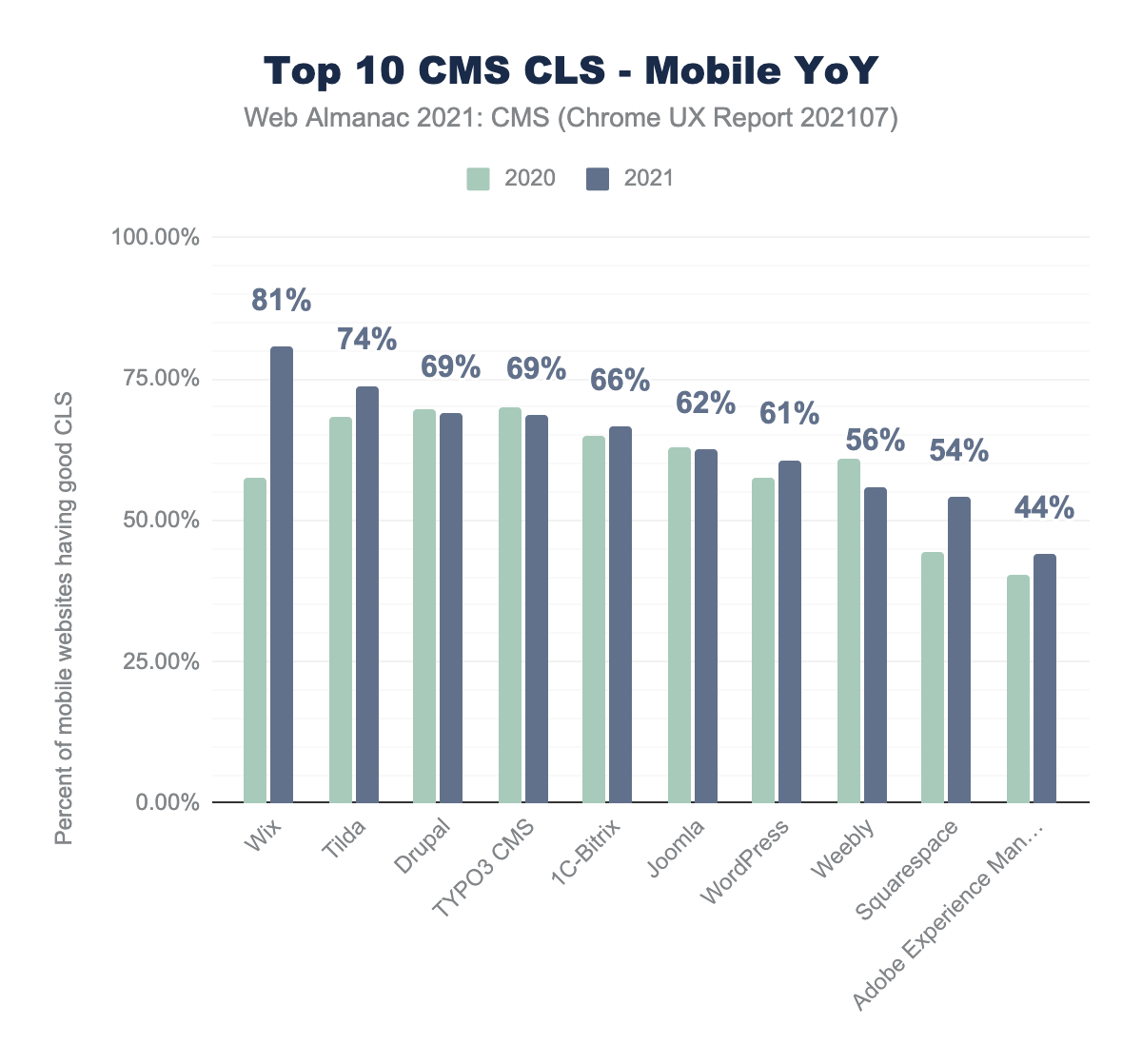 Comparing yearly data, we can see that most CMSs made some progress, or benefited from the change to a windowed CLS metric. However, we can see that certain CMSs such as Weebly regressed in CLS scores over the past year.