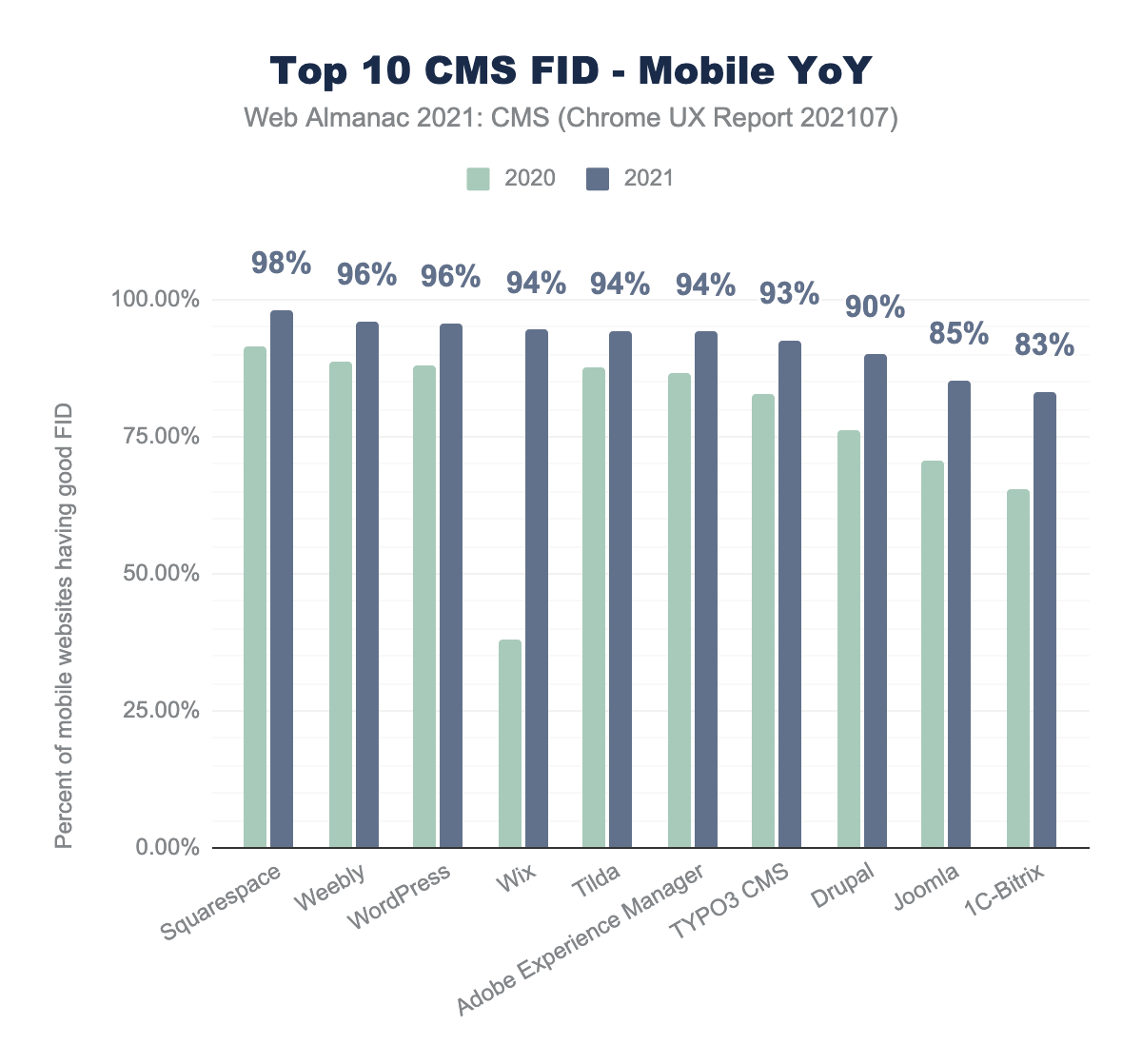 Yearly data shows that all these CMSs managed to improve their FID over the past year. Wix had the most catching up to do on FID, and considerably improved their numbers. Joomla and Bitrix had the lowest FID scores this year, but still managed to improve.