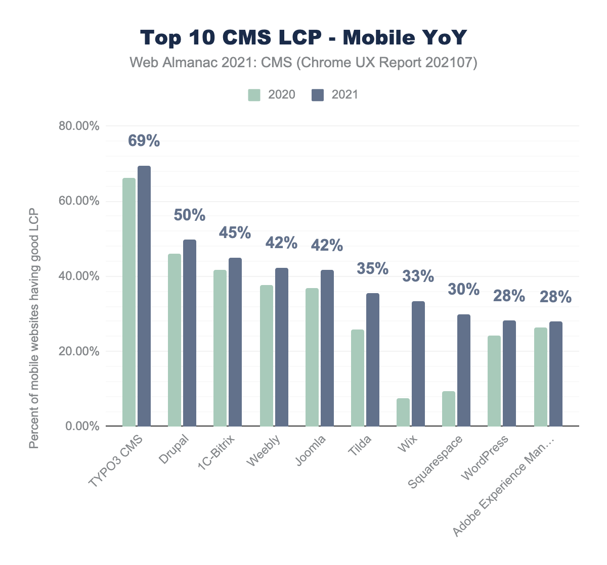 TYPO3 CMS had the best LCP scores with 69% of origins having a “good” LCP experience, while WordPress and Adobe Experience Manager have the worst LCP scores, with only 28% of origins having a good LCP score.