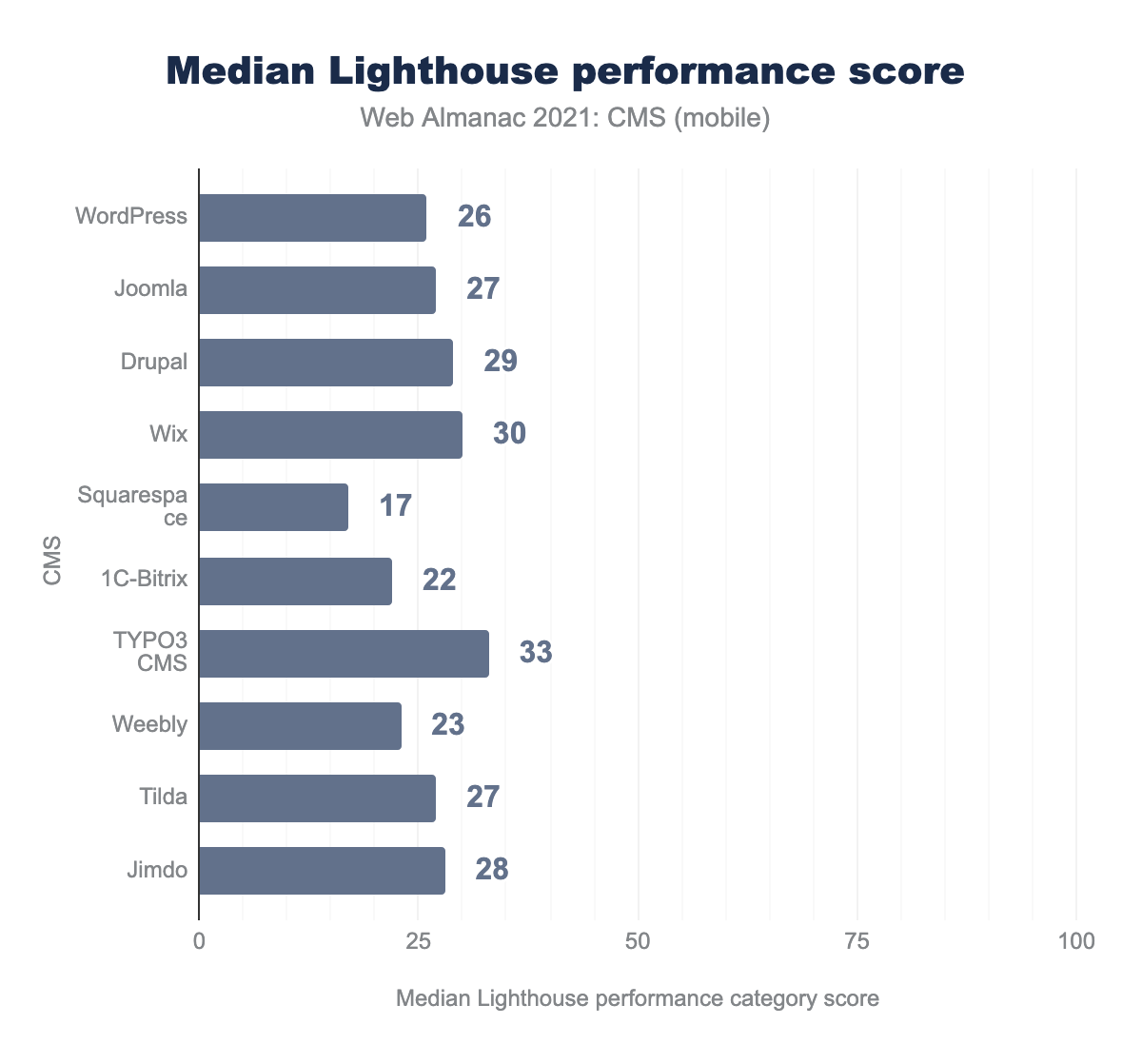 We can see that the median performance scores for all the top platforms on mobile are low, ranging from 17 to 33. As we saw above, this does not directly imply bad results in mobile field data but does imply that all platforms have room for improvements, especially for low-end devices and network connections similar to those Lighthouse attempts to emulate.
