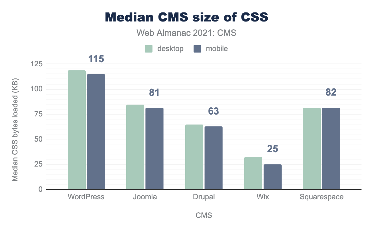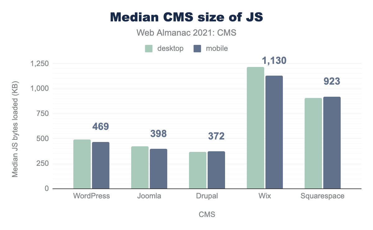 The largest five CMSs all deliver pages that rely on JavaScript, with Drupal delivering the least amount of JavaScript bytes–372 KB on mobile, while Wix delivers the most JavaScript bytes, over 1.1 MB.