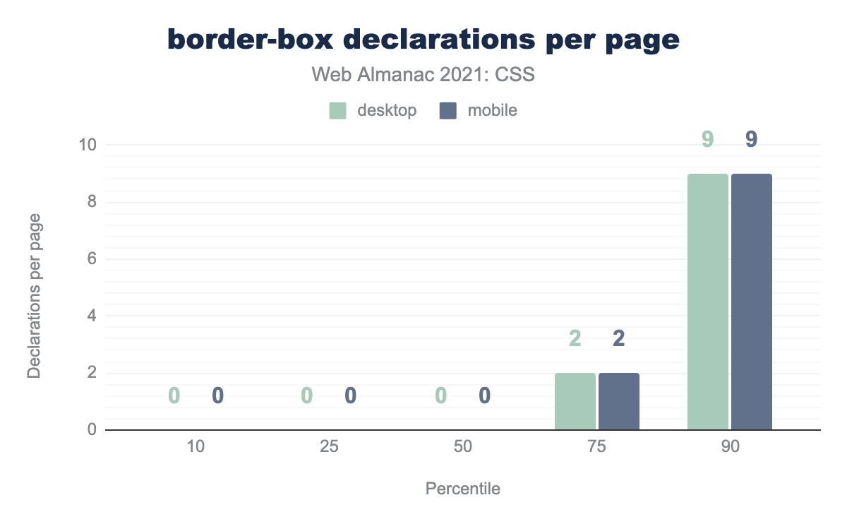 Many CSS methodologies recommend that authors restrict themselves to single classes in order to squash all selectors’ specificity into a single layer that is more easily managed. The BEM methodology, for example, was found on 34% of all pages. The 10th percentile of median selector specificity shows further evidence of this type of thinking, where both desktop and mobile specificity averages at (0,1,0). This is in line with last year’s findings, as are nearly all the medians—with the exception of mobile’s 25th percentile, which rose a little bit.