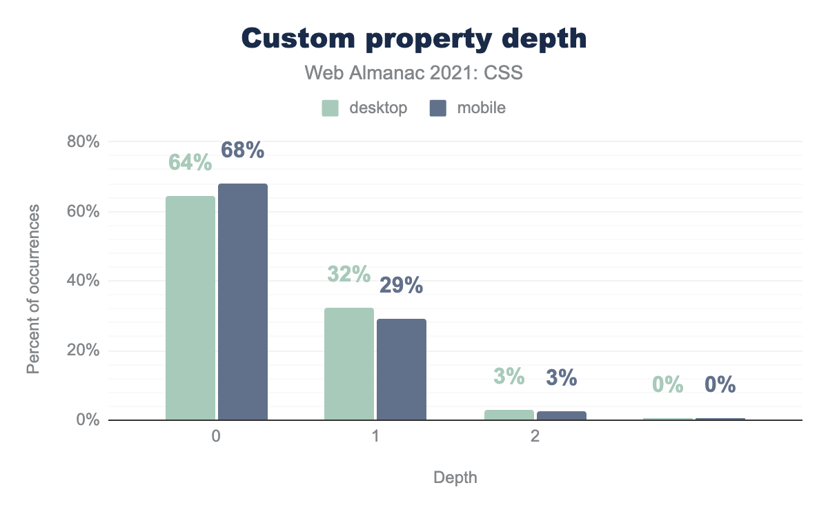 Perhaps unsurprisingly, the clear majority of custom properties had a value depth of zero: they did not include the values of other custom properties in their own values. Nearly a third have one level of depth, and beyond that, there are almost no custom-property values with a depth of two or more.