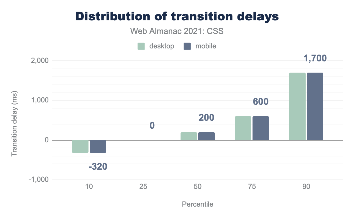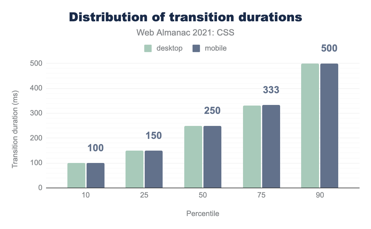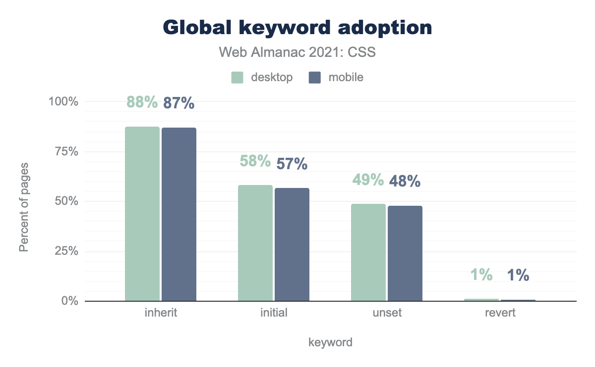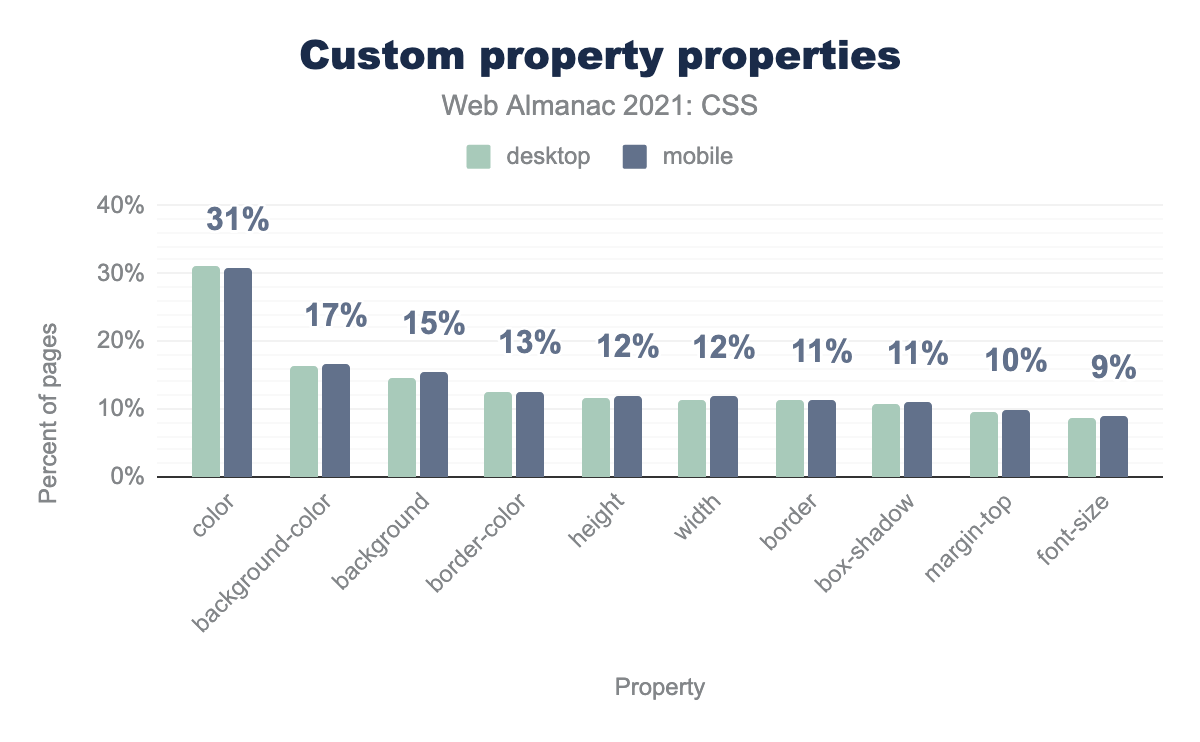 In some ways, CSS Houdini represents the opposite of the CSS-in-JS approach: it allows authors to mix a little JS into their CSS. Perhaps in part due to slow implementation (in browsers that aren’t based on Blink) of core parts of the specification, Houdini has struggled to find its feet. We find that it’s effectively not used on the open web in 2021: only 1,030 desktop pages and 1,175 mobile pages show evidence of animated custom properties, a feature of Houdini. This is a threefold increase over the 2020 findings, but it looks like it will still be some time before Houdini finds an audience.