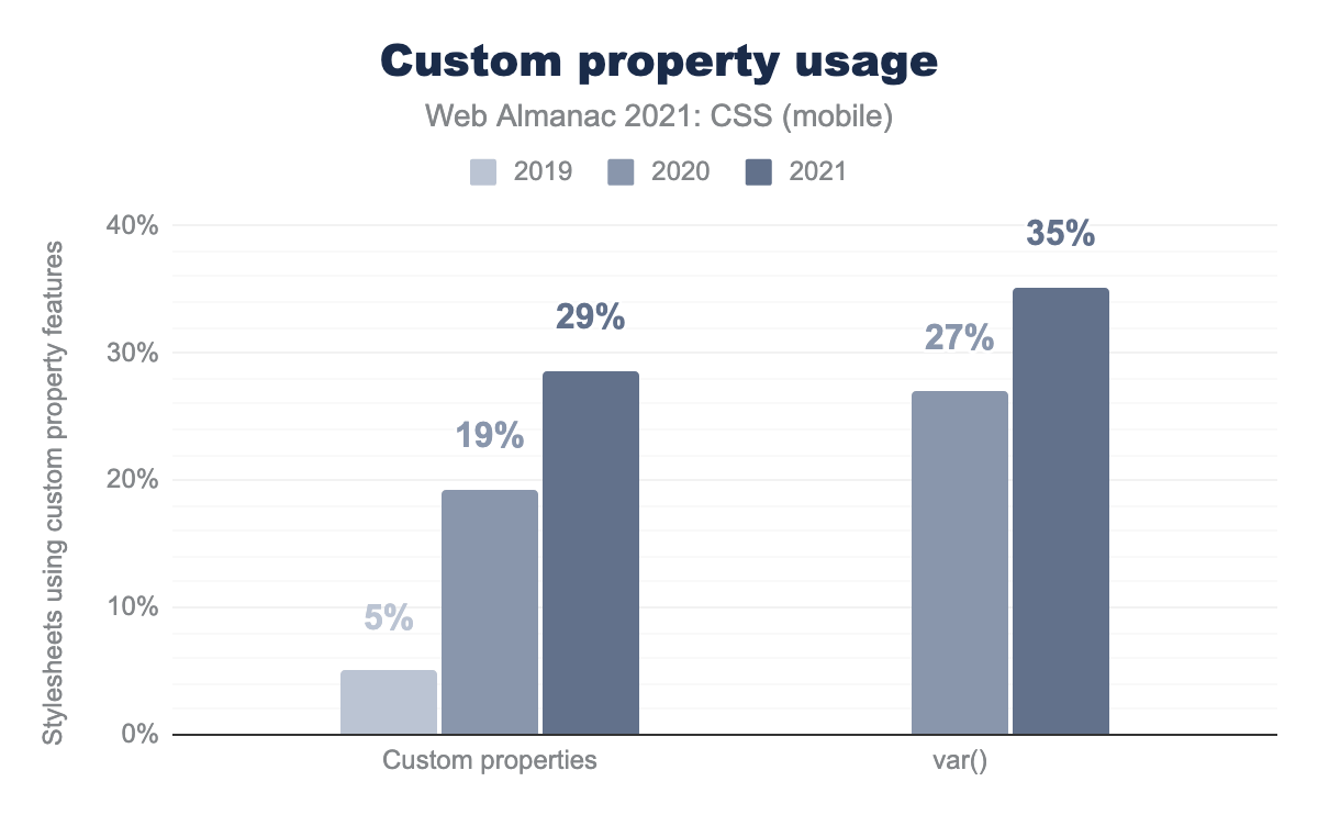 Compared to last edition, the 2021 Web Almanac offers a deeper insight into how the use of CSS differs in the realm of what we all think we need versus what we actually see in production. As the calls for more robust CSS features and the challenge of centering a <div> with CSS kept making the rounds on our blog posts, conference talks, and Twitter chatter, pages around the web offered us vastly contradicting results, betraying the fact that CSS has, perhaps, become old enough to put more thought on staying stable instead of going wild with the zaniest of toys.