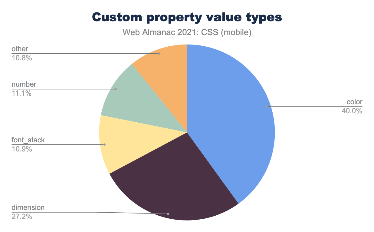 As in 2020, we also checked the selectors in which custom-property values were used. Almost 60% were set on the root element (using either the :root or html selectors), and around 5% were applied to the <body> element. The rest were applied to some descendant of the root element other than <body>. This means around two-thirds of all custom properties are used as what are, in effect, global constants. This is in line with the results seen last year.