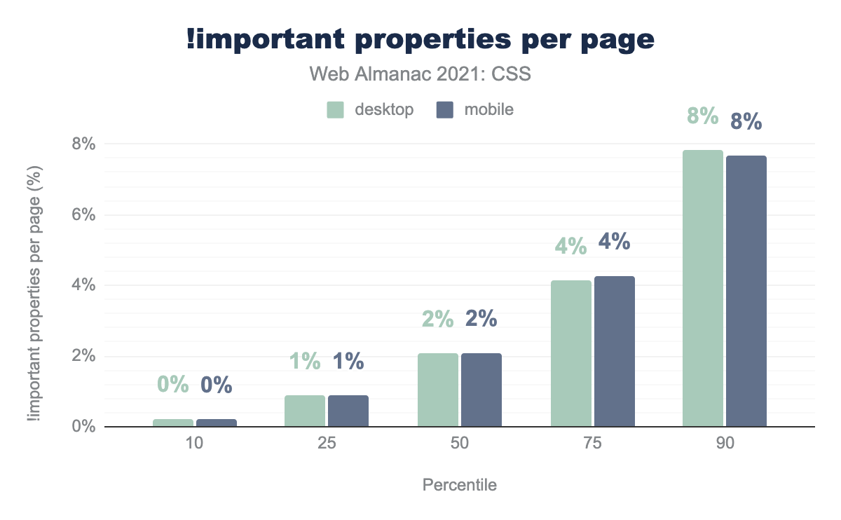 If that seems like a lot, hold on to your IDEs: we found a mobile page with 17,990 rules marked !important! That just edged out the most-important desktop page, which had 17,648 specificity-busting rules. We sincerely, truly hope these were the result of a script or preprocessor gone wrong.