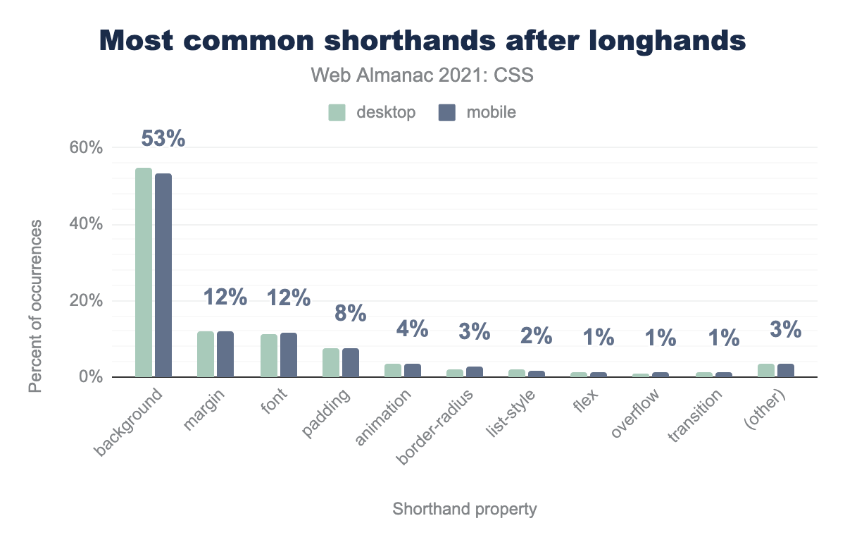 Since background longhand properties were at the top of the previous section’s chart, we turned our attention to the use of background shorthands and longhands.
