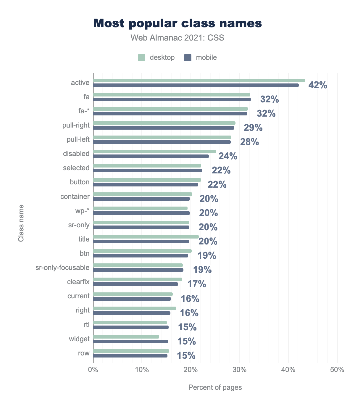 Much like last year, the most popular class name on the web is active, and the fa, fa-* (the Font Awesome prefix), and wp-* (the WordPress prefix) class names make very strong showings. selected and disabled switched places in the lineup compared to last year, but the most heartening change was a 5% drop for clearfix, a sign that float-based layout continues to wane.
