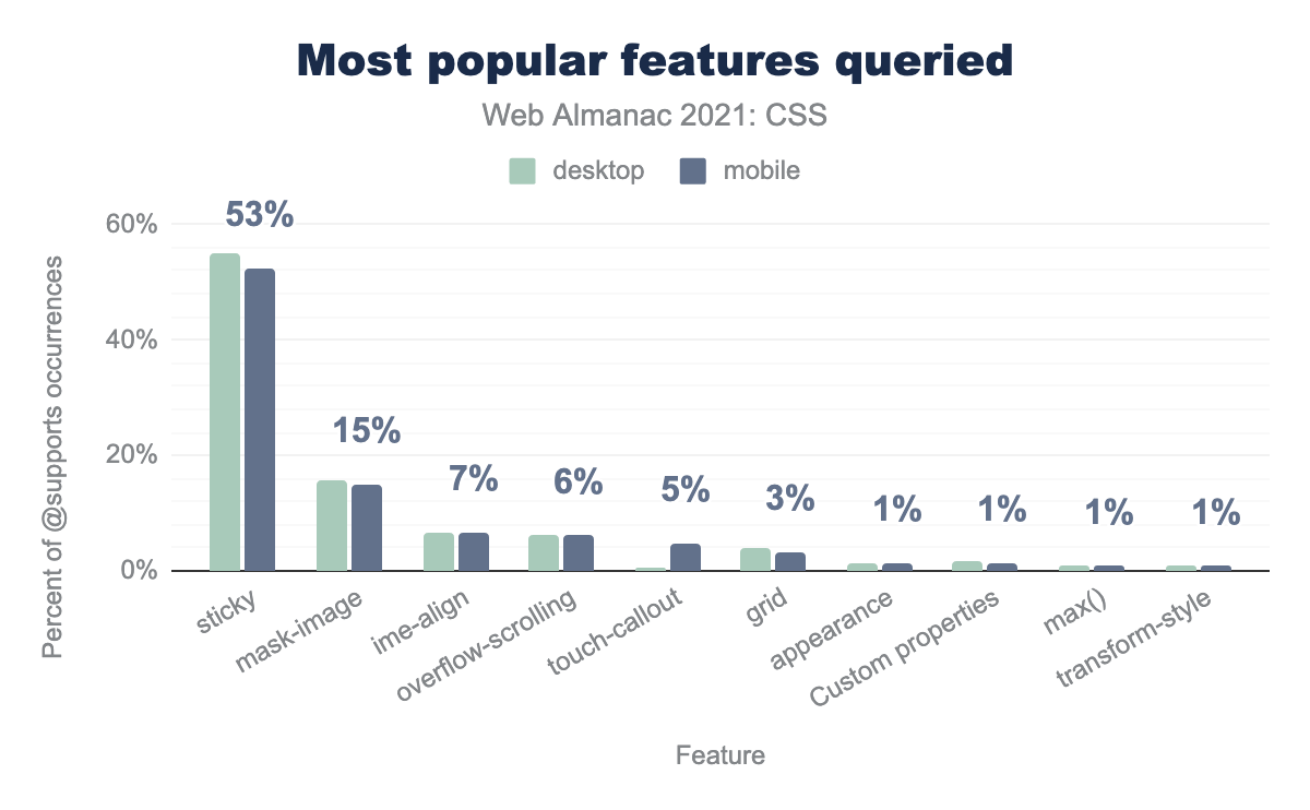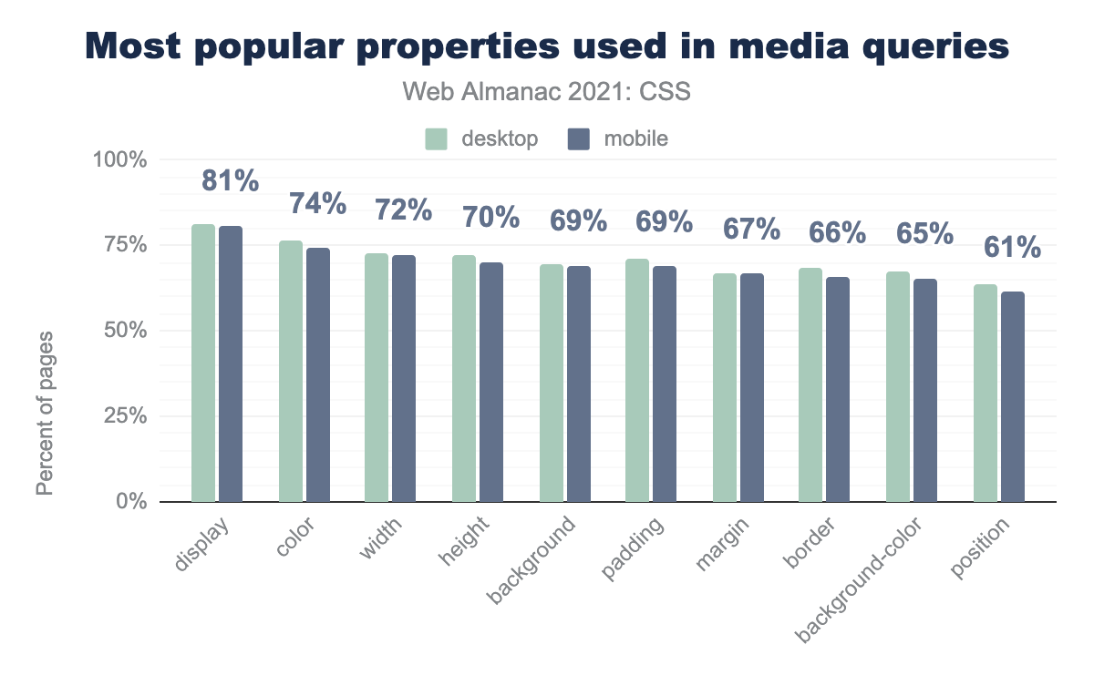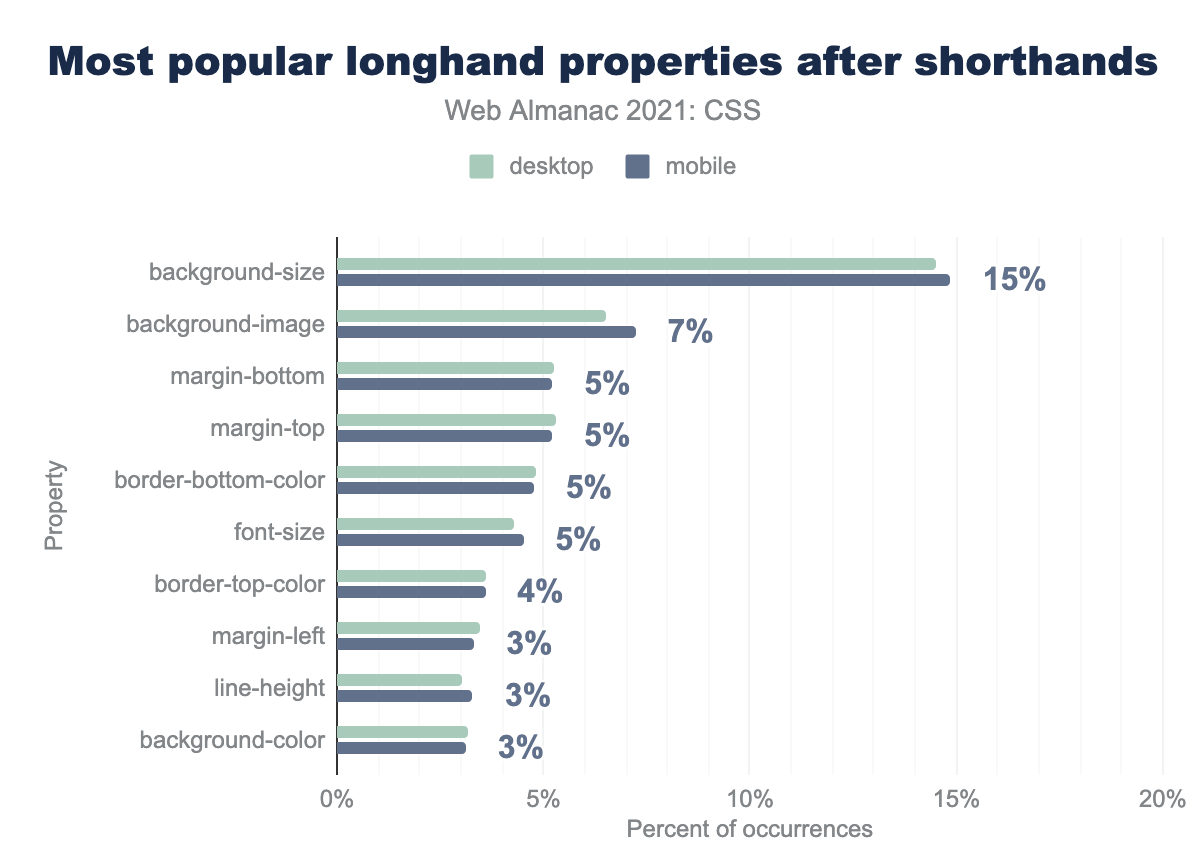 As in 2020, the winner was background-size, although last year it showed up in 41% of such cases on mobile, and this year was seen in only 15% of such cases.