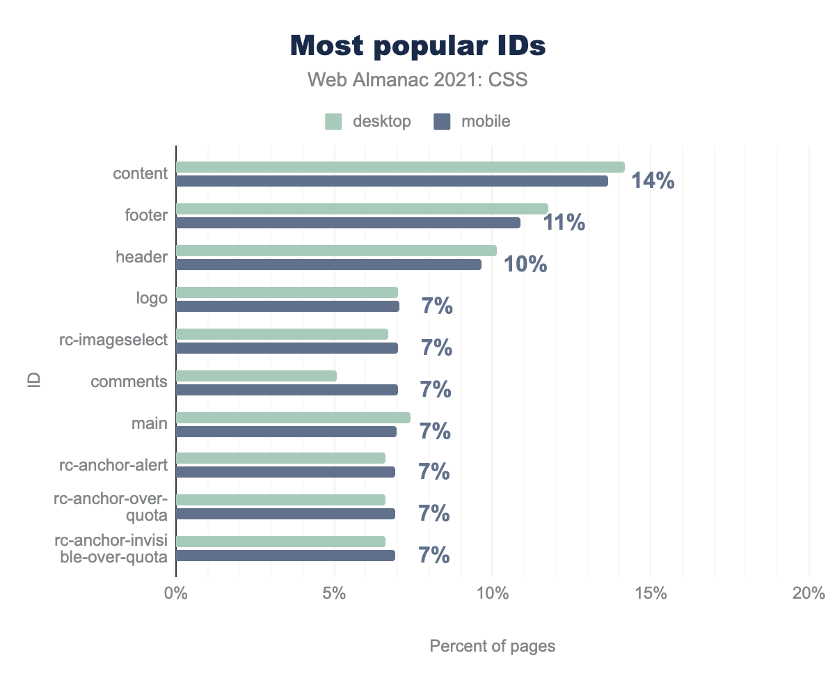 Pages continue to use IDs, and at about the same rate as seen in 2020. Even the list of popular ID names is consistent: content sits in the top spot at about 14% of pages, followed by footer and header. These latter two IDs dropped about a percent versus last year, which isn’t really enough to say anything definitive about them other than, developers should replace them with the corresponding HTML elements <header> and <footer> whenever possible.