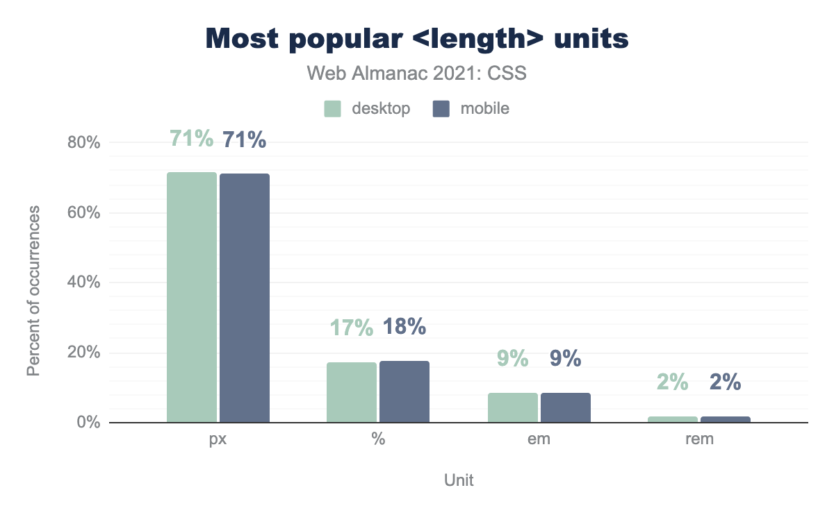 Whatever you may think of pixel lengths, it’s still the most popular length unit by far, appearing in about 71% of all pages. The second-place length unit, percentage, trailed pixels by an overwhelming distance.
