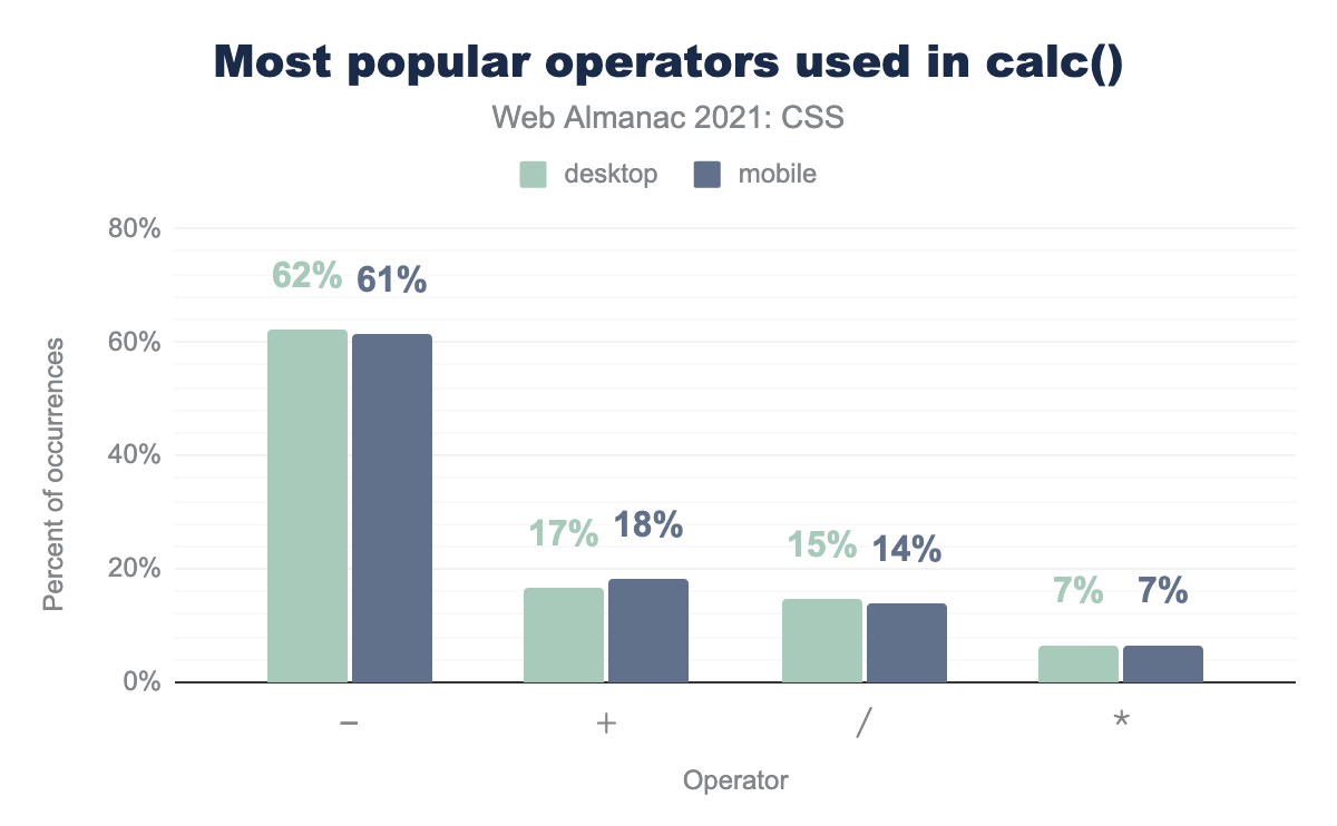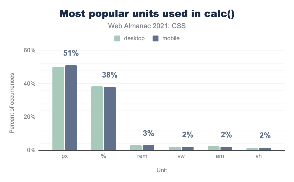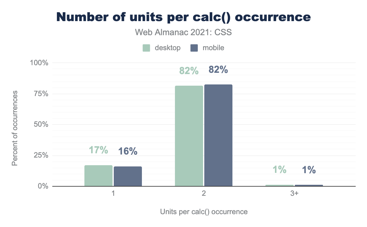 calc() values remain relatively simple, with the overwhelming preponderance of calculations using two different units, such as to subtract pixels from the calculated result of a percent value. A total of 99% of all calc() expressions use either one or two unit types.