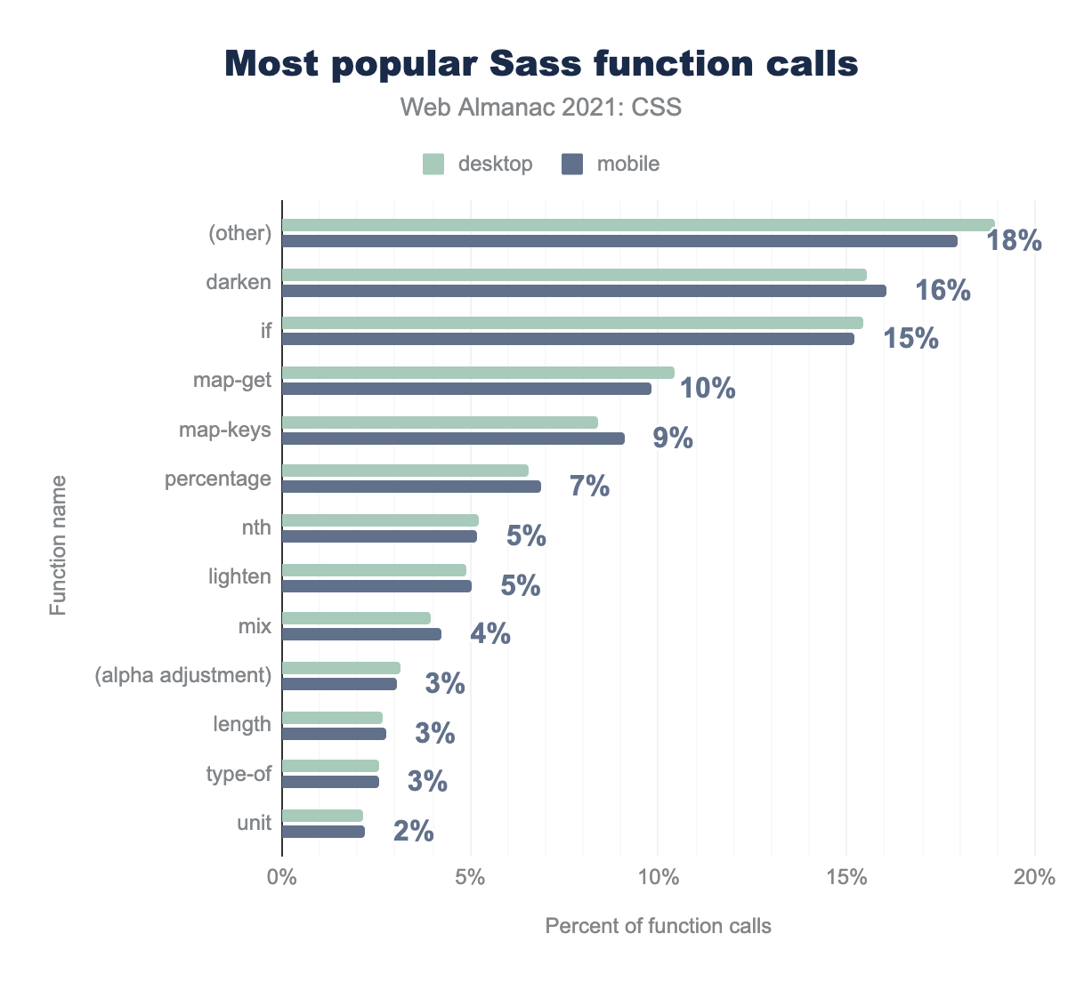 The Sass functions we found in use largely mirrored those found in the 2020 Web Almanac, albeit with some changes in the specific percentages. When classified by type, we found that 28% of all Sass functions were those that modify colors (e.g., darken, mix) and a further 6% were used to read color components (e.g., alpha, blue).