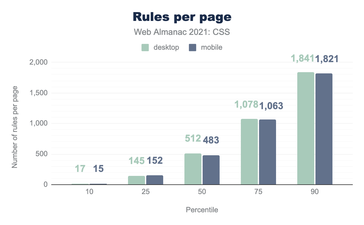 Number of stylesheets is one thing, but what about the number of actual style rules? Compared to last year, the lower percentiles rose a bit, while the highest barely budged. What is different in 2021 versus 2020 is that across nearly all percentiles, desktop pages have more rules on average than do mobile pages.