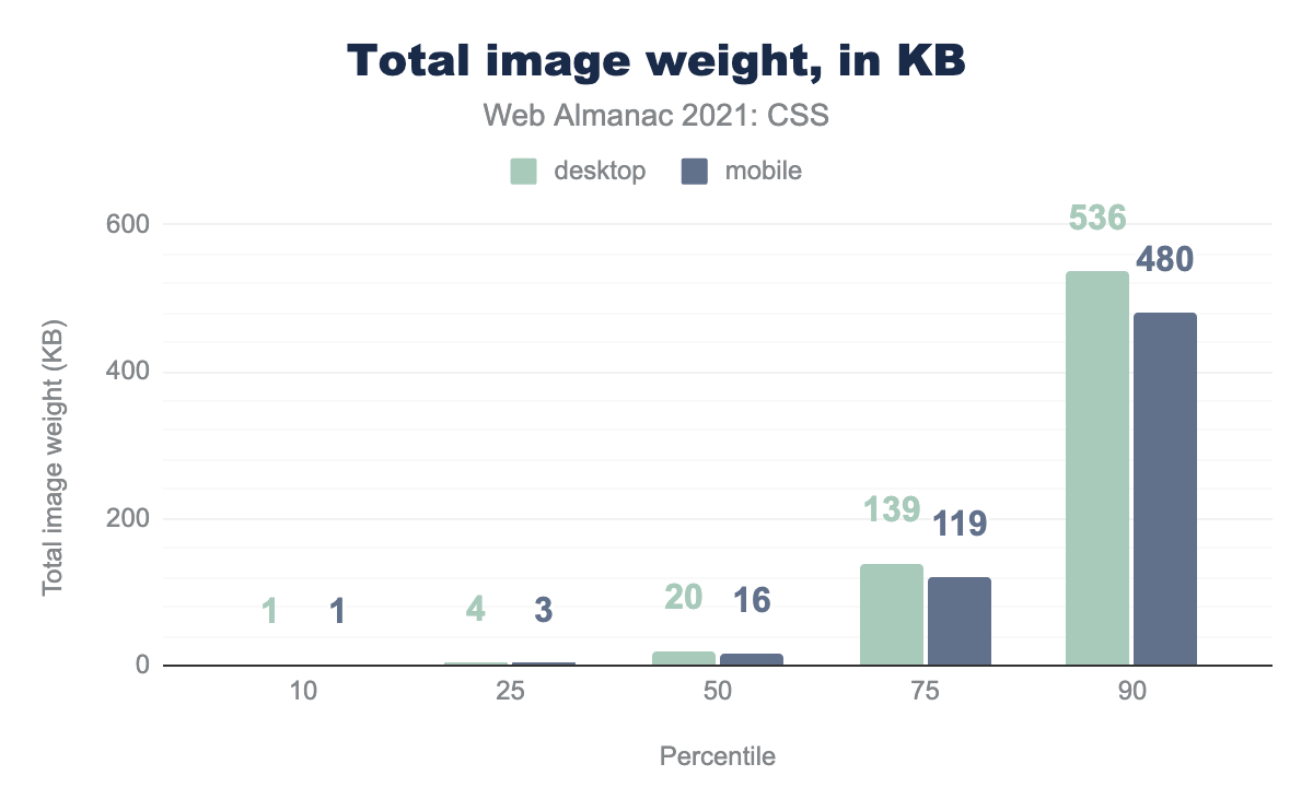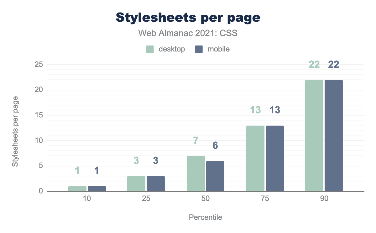 It isn’t the heaviest component of most pages, but CSS—like the rest of the web—continues to grow in size from year to year. The median web page loads around 70 KB of CSS, and at the upper end, the average size is just over a quarter of a megabyte. Compared to 2020, the median total CSS weight rose about 7.9%, and the 90th percentile just under 7%, while preserving the pattern seen last year that mobile CSS is a little smaller than desktop CSS across all percentiles.