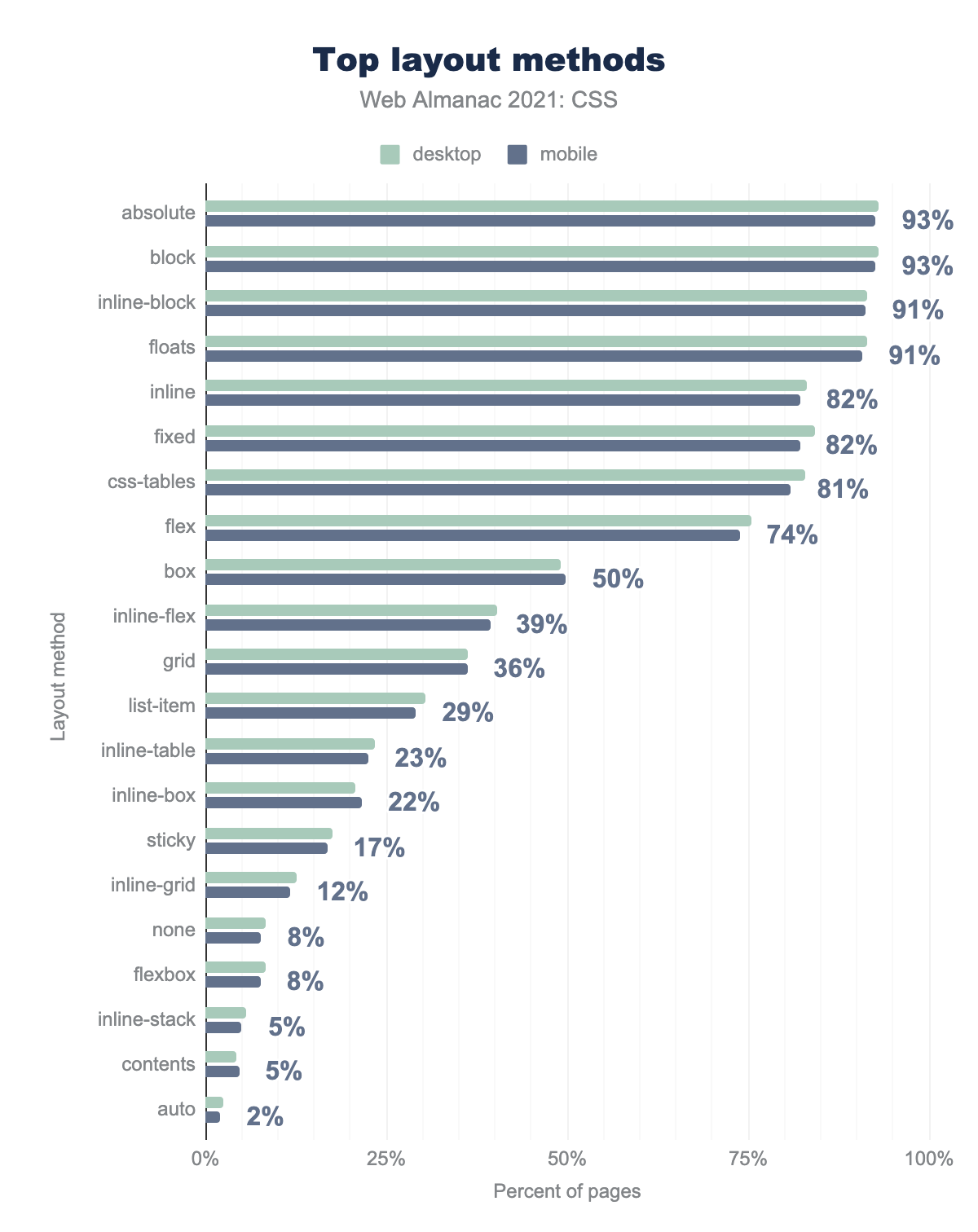 It must be noted that there is a great deal of volatility in these figures as compared to last year’s, such as flex-basis doubling in usage on mobile while not really shifting on desktop. This could be due to changes in a common framework used in mobile development, or it could be some other factor.