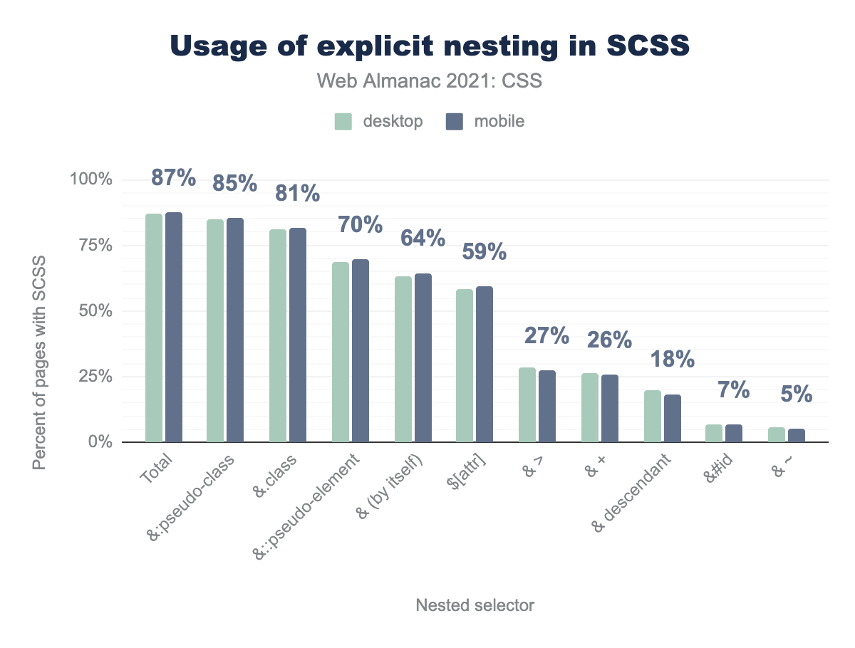 Another of Sass’s major draws is the ability to nest rules inside other rules and thus avoid having to write repetitive selector patterns. This capability is under development for native CSS, and our analysis shows why: 87% of all Sass stylesheets use a detectable form of rule nesting. Implicit nesting, which does not require special characters, was not measured.