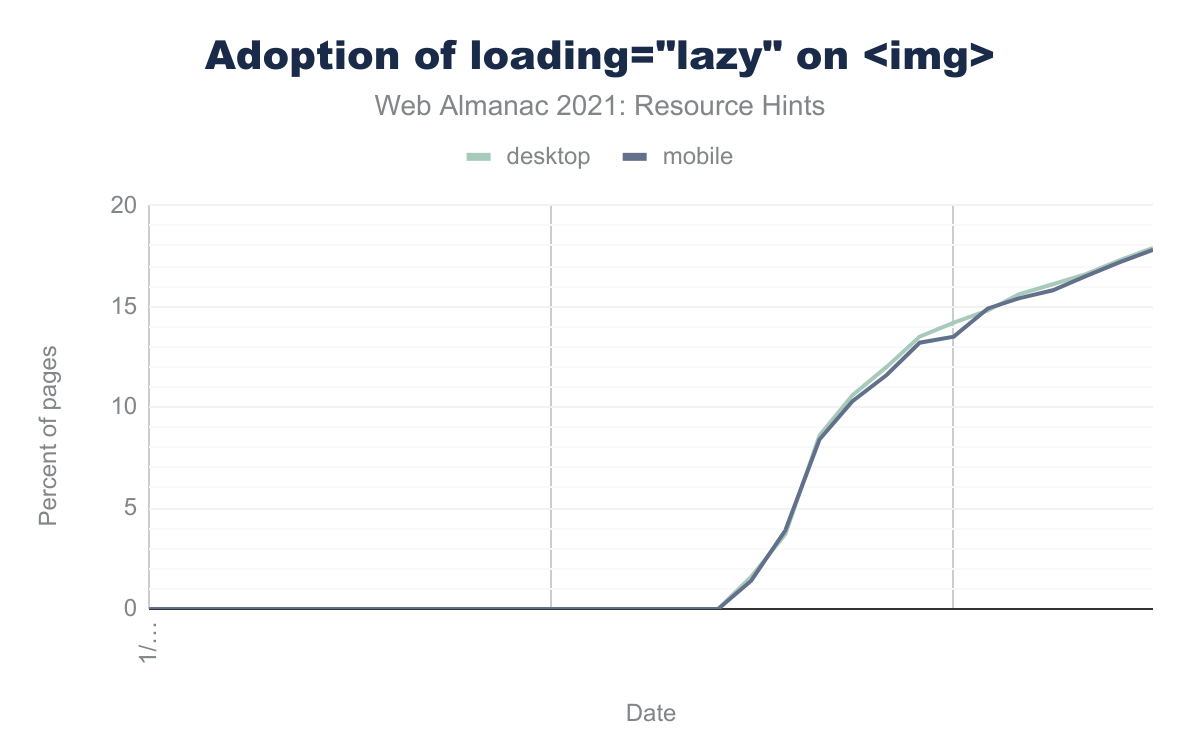 loading="lazy" attribute on img elements on desktop and mobile. At the start of 2019 the adoption rate is 0% on desktop and 0% on mobile. At the start of 2020 the adoption rate is 0% on desktop and 0% on mobile. At the start of 2021 the adoption rate is 14.2% on desktop and 13.5% on mobile. As of July 2021 the adoption rate is 17.9% on desktop and 17.8% on mobile.loading="lazy" attribute on img elements.