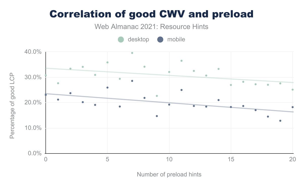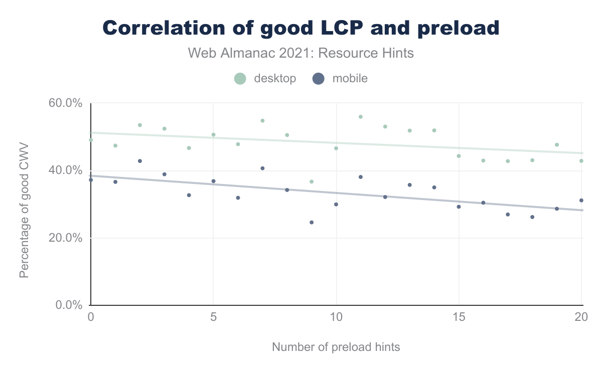 rel="preload" hints on that page. 49.0% of desktop pages, and 37.2% of mobile page with 0 preload hints have a good LCP score. 42.8% of desktop pages, and 31.1% of mobile pages with 20 preload hints have a good LCP score.rel="preload" hints
