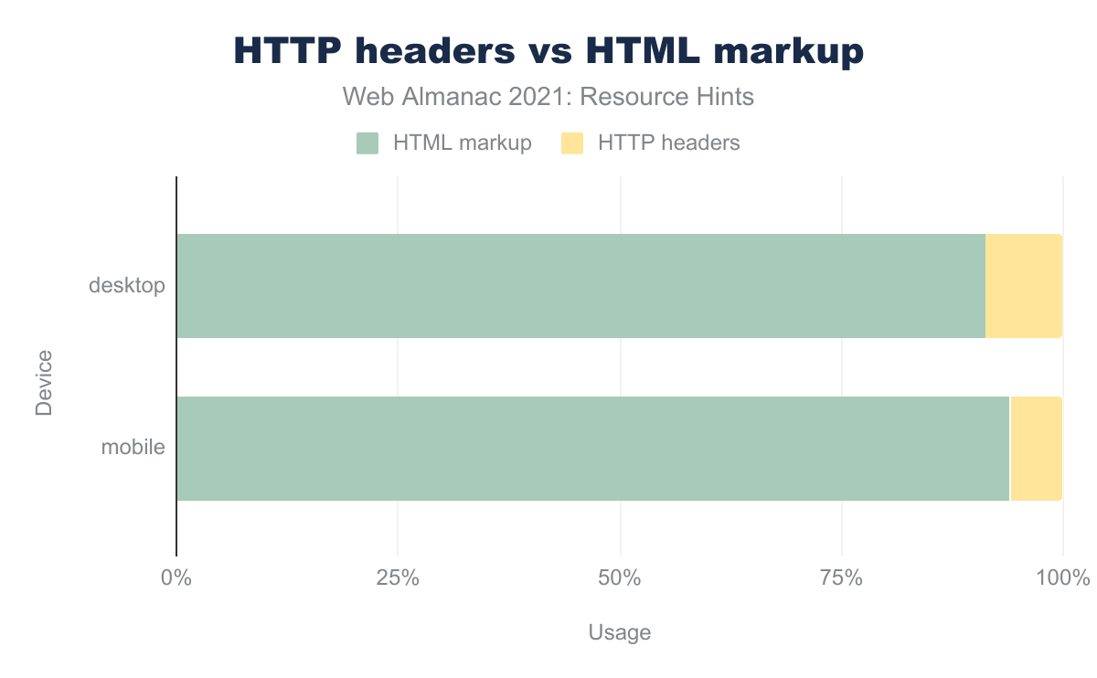 Adoption for HTTP headers is significantly lower than having resource hints implemented as part of the document markup; with less than 1.5% of the pages analyzed implementing resource hints through HTTP headers. This is likely attributed to the ease with which they may be added or modified from within the HTML source, when compared to adding an HTTP header on the server.