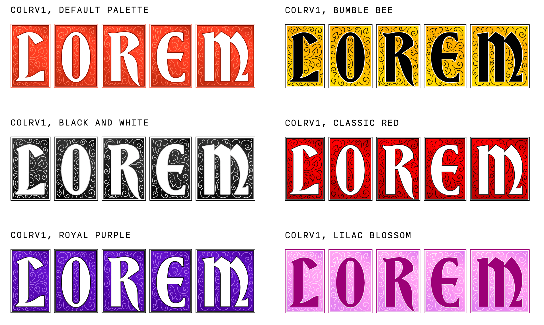 The CSS specification has been updated to support color fonts to allow selection and customization of palettes. Palettes are custom color schemes stored in the font by the type designer. The CSS font-palette property allows you to select a palette from the font and the @font-palette-values rule allows you to create new palettes or override existing ones. One of the more obvious use cases of this technology is to have light and dark mode palettes built right into the color font. There is a lot of unexplored potential there.
