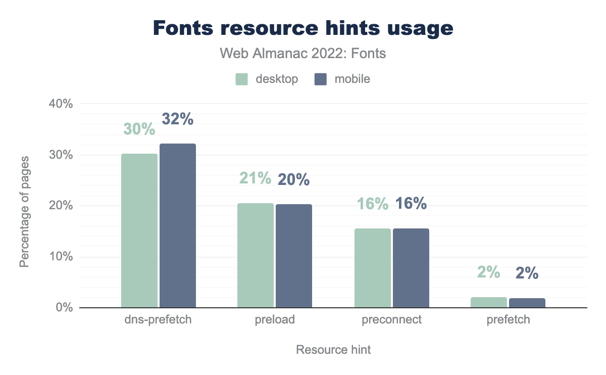dns-prefetch is used on fonts on 30% of desktop pages and 32% of mobile pages, preload on 21% and 20% respectively, preconnect on 16% and 16%, and finally prefetch is used on 2% of desktop and 2% of mobile pages.There hasn’t been any large change in the use of dns-prefetch hints since 2020, but there has been a fairly significant increase in the use of preload (from 17% in 2020 to 20% in 2022) and preconnect (from 8% in 2020 to 15% in 2022). This is great!