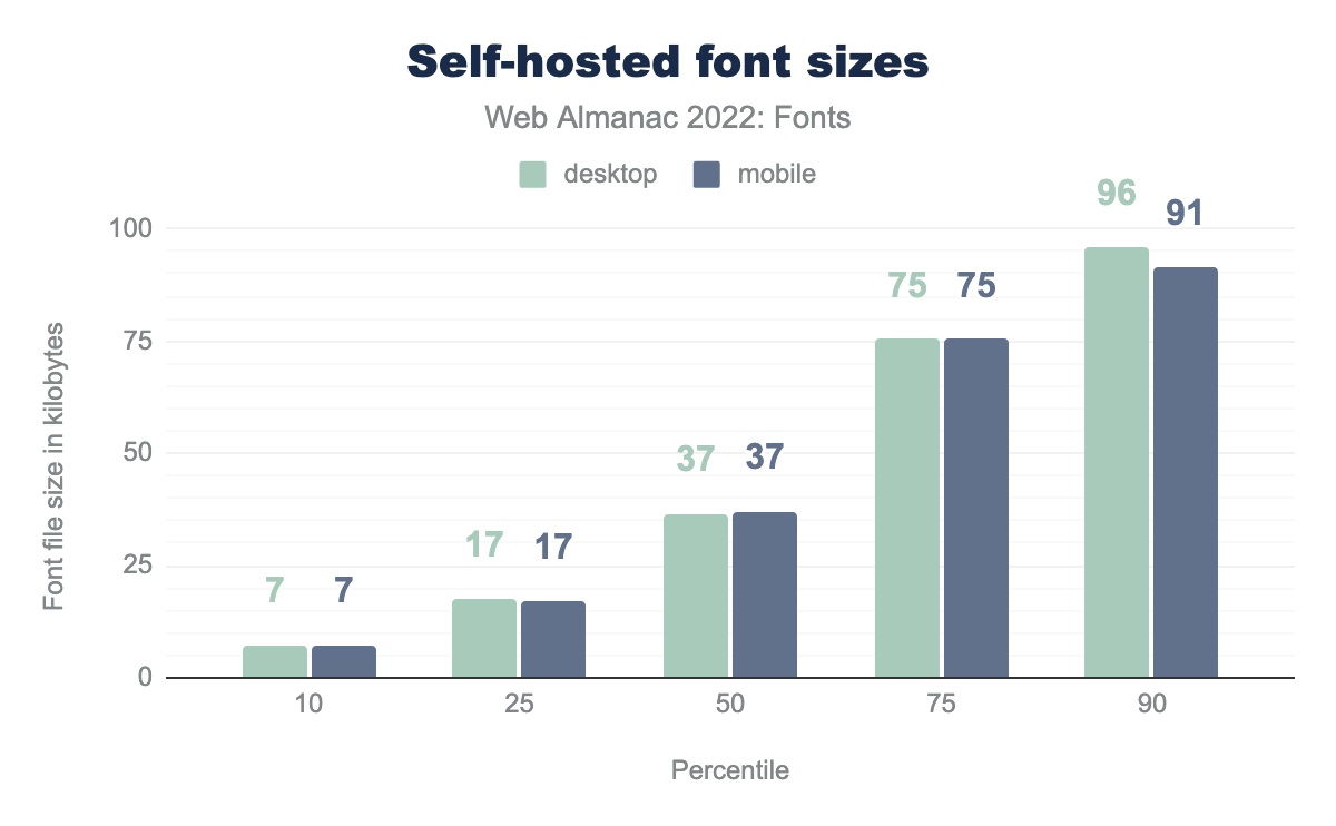 Compression is a great way to reduce the amount of data that needs to be downloaded, but it has its limits. To better understand what influences font file sizes, let’s take a look at the median font sizes across all fonts.